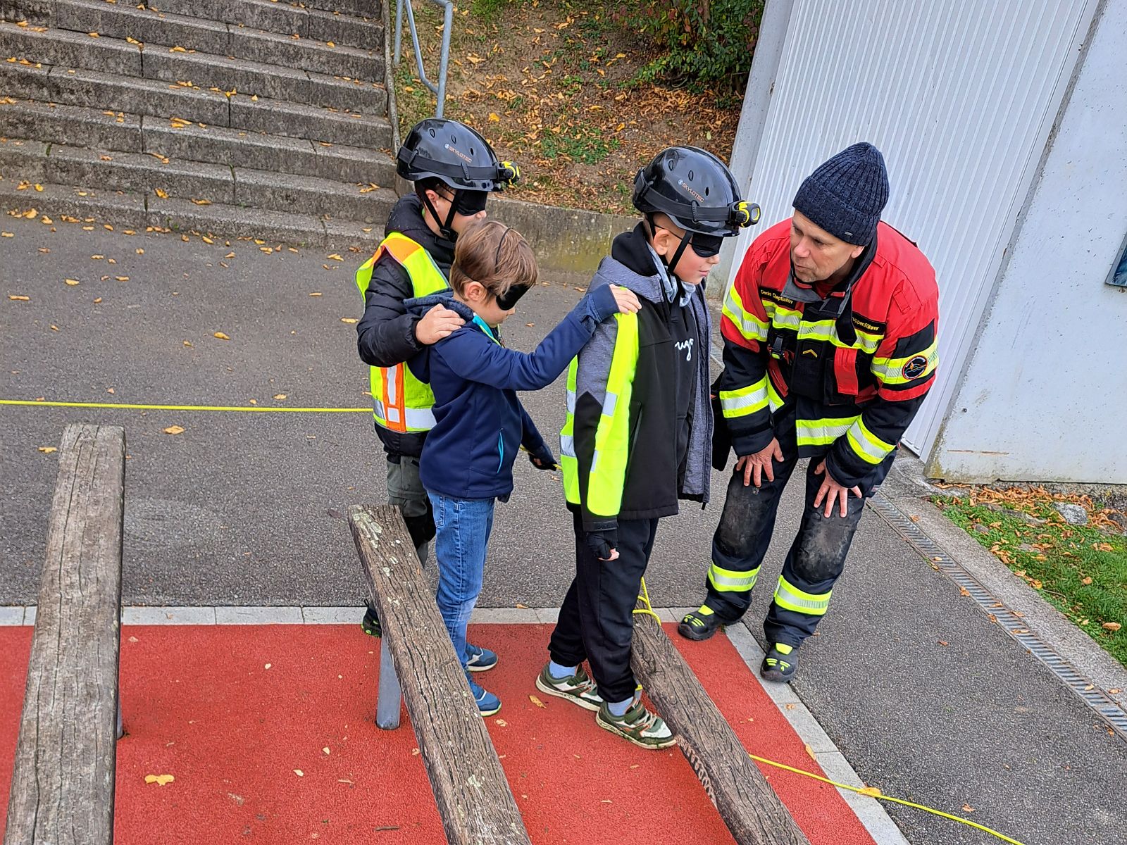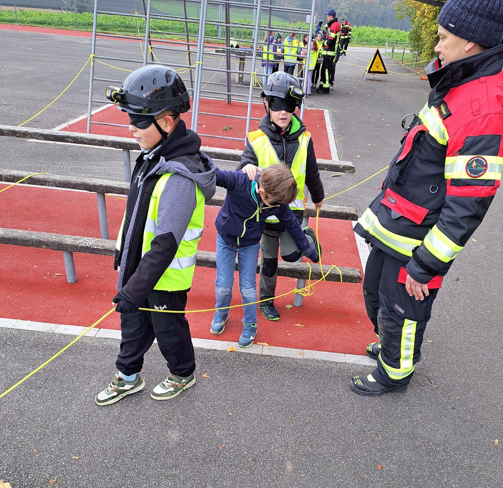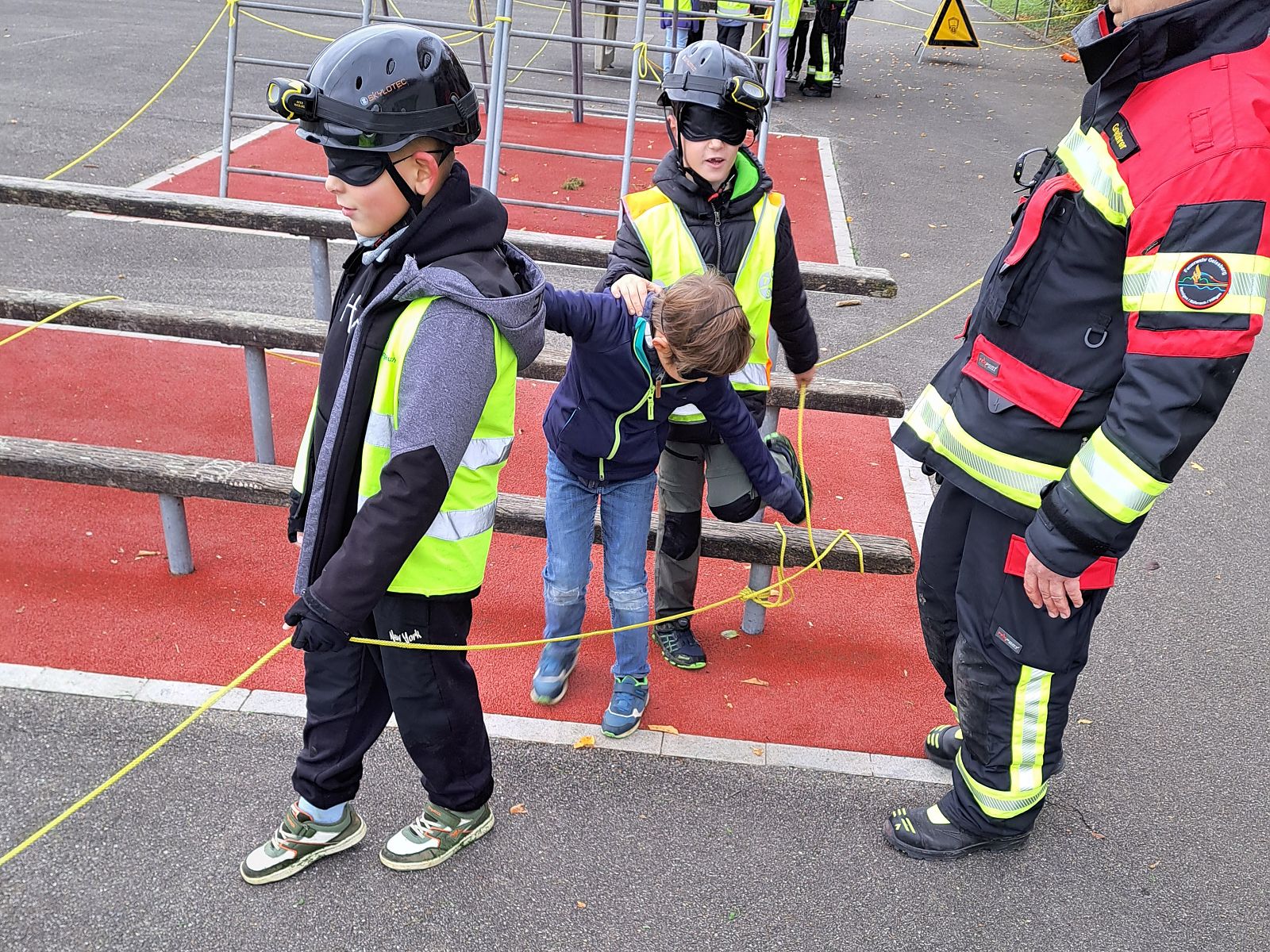 Nach einer Evakuationsübung im Schulhaus durften sie in Rüfenach bei diversen Posten zuschauen und auch selber mitmachen. Es gab Brände zu löschen, eine Simulation ohne Sicht mit Hindernissen zu erleben oder sie konnten der Sanität bei lebensrettenden Massnahmen über die Schulter schauen und es danach selber versuchen. Mit viel Freude haben die Kinder mitgeholfen und Vieles selbst ausprobiert.