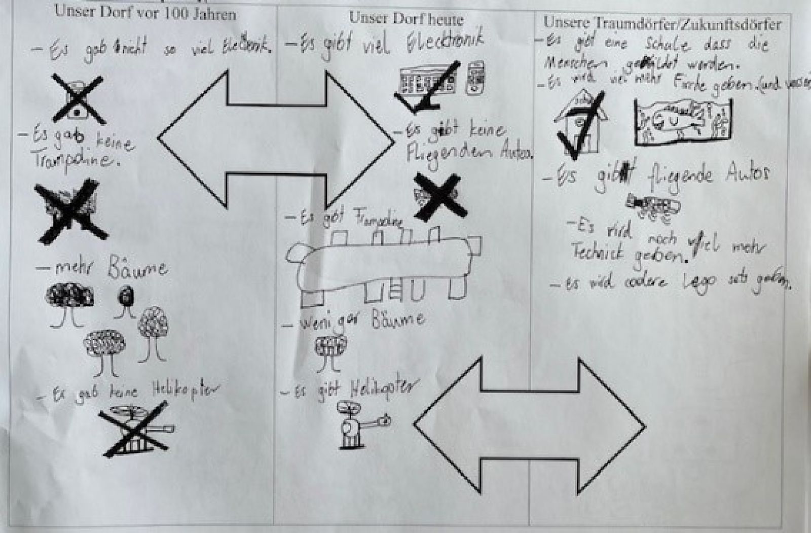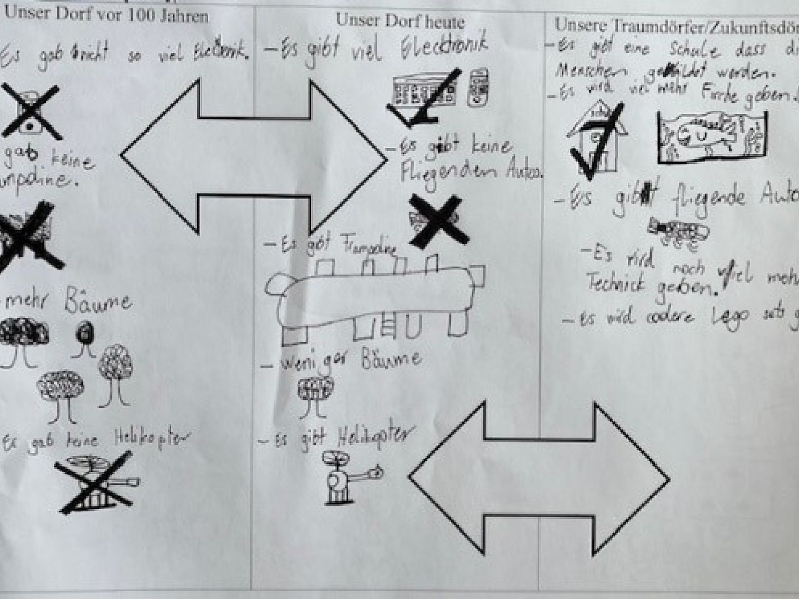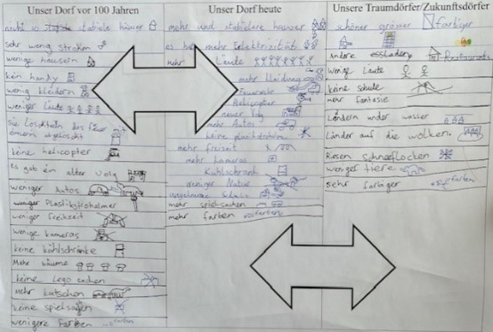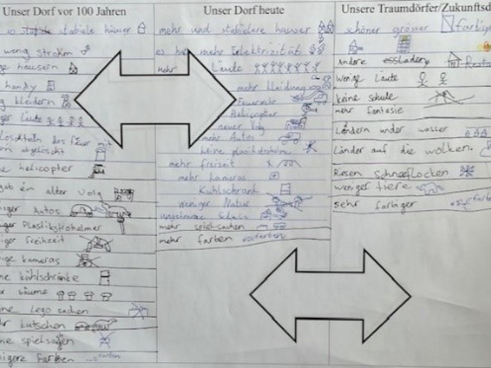 Um nun die drei Stadien zusammenzufügen - Vergangenheit, Gegenwart, Zukunft - sollten die Kinder abschliessend vergleichen. Dabei fielen ihnen viele verschiedene Fakten auf, zum Beispiel, dass es früher kein fliessendes Wasser in den Häusern und weniger Autos gab.